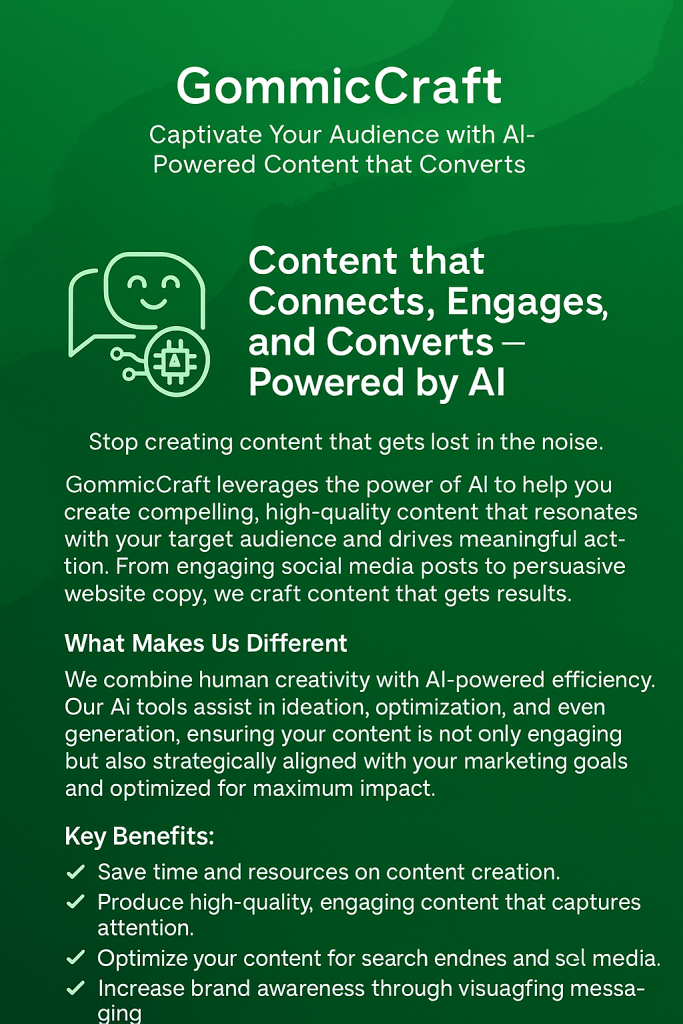 Stop creating content that gets lost in the noise. GommicCraft leverages the power of AI to help you create compelling, high-quality content that resonates with your target audience and drives meaningful action. From engaging social media posts to persuasive website copy, we craft content that gets results.
